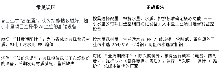 企業在選擇成套污水處理設備時,易陷入 “只看采購價、忽視長期成本”“盲目追求高端配置” 等誤區,需從 “需求匹配、成本核算、風險規避” 三個維度科學選型: