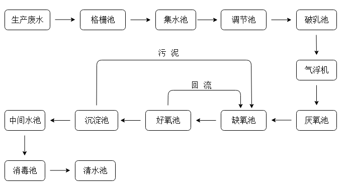 (1)預(yù)處理:廢水進(jìn)入格柵池通過格柵截留大顆粒物質(zhì),再自流入調(diào)節(jié)池以平衡水質(zhì)水量,使廢水均勻進(jìn)入后續(xù)處理單元;