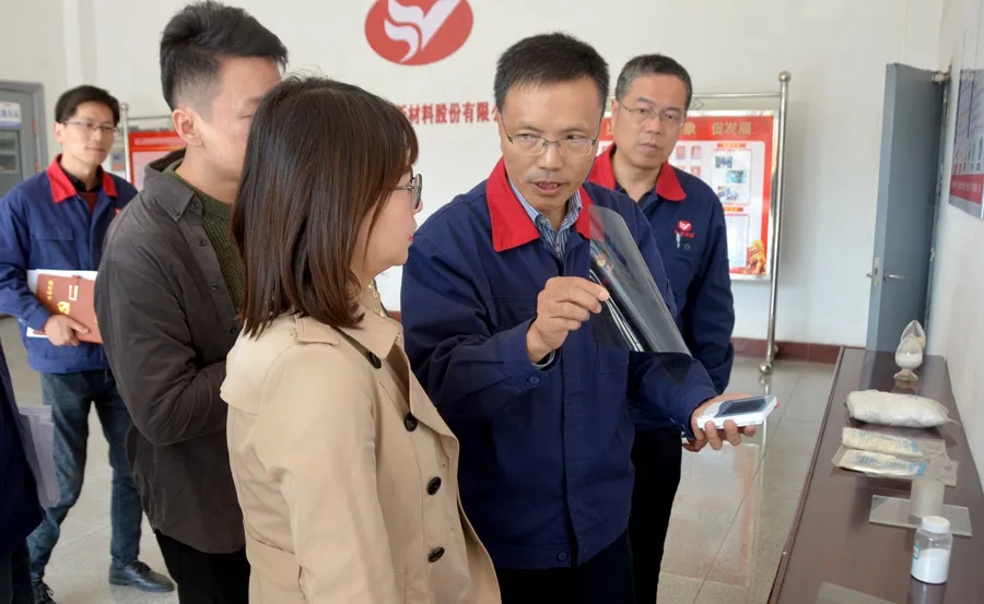 錢文一行首先來到PVA膜分廠。高申保向來賓介紹了公司新建、擬建的重點項目,他表示,當前公司正全力推動產業轉型升級,以高新技術作為發展動力,建設行業世界當先“品質皖維”。公司響應創新驅動發展戰略,聚焦PVA光學膜等關鍵產品的研發,經過多年研究,已實現了產品產業化。此外,為進一步攻關高端PVA膜的關鍵重要技術,公司還與中國科學技術大學成立聯合實驗室,已在多個方面取得重要進展,為產品打破國外壟斷,加速推動顯示行業國產化作出了皖維貢獻。