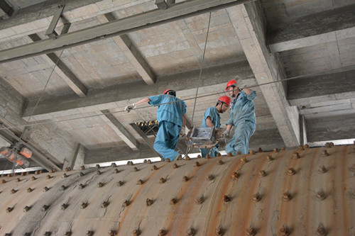 “高空作業”——圖為水泥分廠2#水泥磨上,工人們正在拆卸磨門